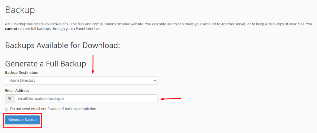 Backup Destination: Choose where you want to store your backup. You can either store it on the server (Home Directory), or you can have it emailed to you or saved to a remote FTP server. Choose the appropriate option based on your preference.