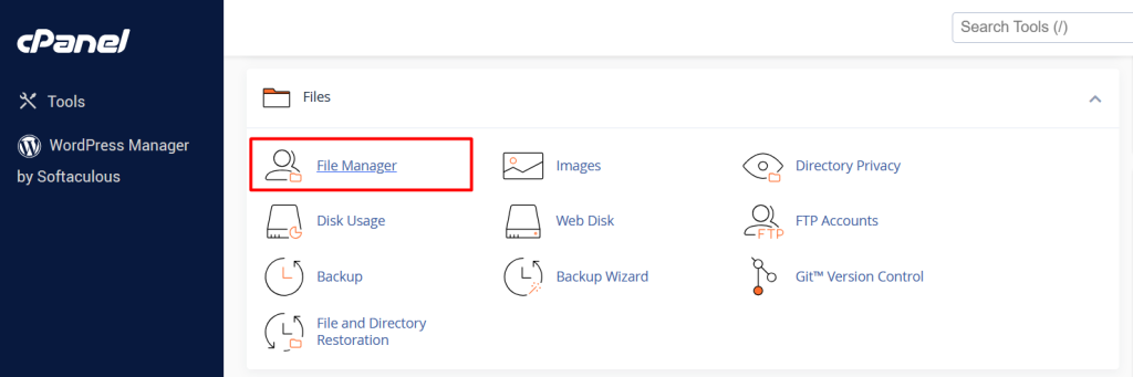 Locate File Manager: Once logged in, find the “File Manager” icon or option. This is usually located under the “Files” section of cPanel. Click on it to open the File Manager.