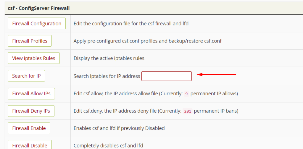 Within the CSF interface, you should find an option to manage blocked IPs. Look for a section titled something like “Block/Unblock an IP” or “Firewall Management”.