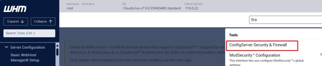 Once logged in, search for “ConfigServer Security & Firewall” or “CSF” using the search bar at the top left corner of WHM’s interface.